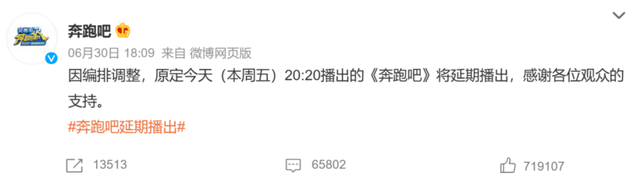 6月30日,综艺节目《奔跑吧》官方微博发博表示,因编排调整,原定于当晚播出的节目将延期播出,而蔡徐坤就是该期节目的飞行嘉宾之一。