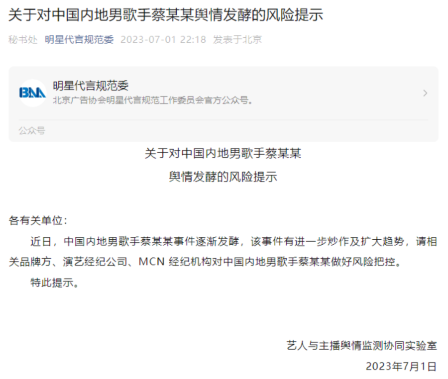 7月1日,北京广告协会明星代言规范工作委员会在微信公众号发布《关于对中国内地男歌手蔡某某舆情发酵的风险提示》,其中涉及的蔡某某疑似最近风波不断的蔡徐坤。同一天,蔡徐坤的豆瓣主页也被短暂清空过一段时间,后又恢复。