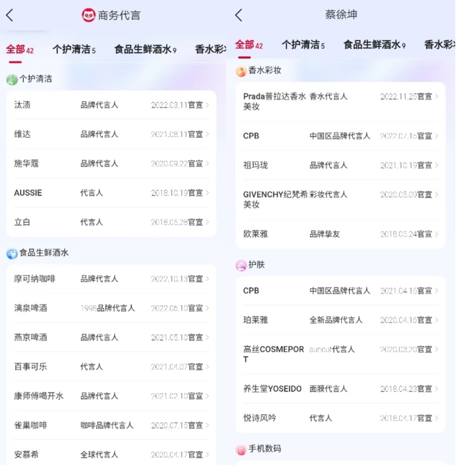 《2022中国娱乐营销白皮书》显示,蔡徐坤因“高黏性粉丝和不俗的品牌资产提升力”位列明星商业价值榜单中的第四名。具体而言,猫眼专业版数据显示,蔡徐坤至今官宣的品牌合作多达42家,覆盖到Prada、CPB、汰渍、维达、百事可乐、vivo等多个赛道的多家品牌,每年产生的代言费用也在上亿级别。