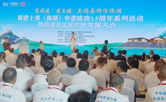 7月6日,福建土楼(南靖)申遗成功15周年系列活动暨南靖县文旅经济发展大会在格兰云天酒店启动。本次活动以“来福建·看土楼,五福南靖任你游”为主题,旨在以“文旅”为媒,结合南靖资源禀赋优势,推动“全域旅游·全面发展”,打响“福建土楼·五福南靖”品牌,全方位、多角度展示南靖文旅魅力,共谋文旅发展蓝图。