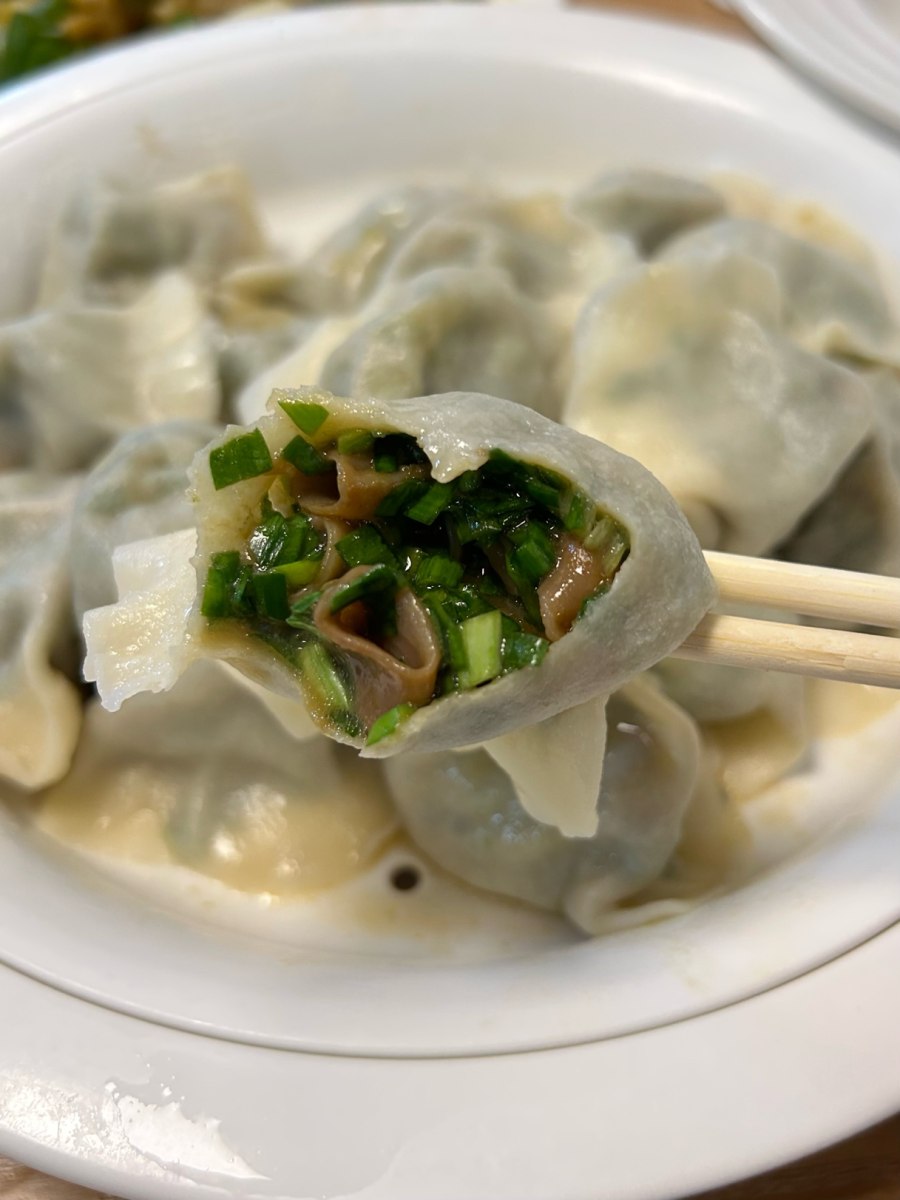 饺子个儿很大,韭菜煮的火候刚刚好,还有点儿脆甜。不过一开始没有吃出来这个饺子好到哪儿,后来一口一个才发现精华所在:连汁带水儿,连皮儿带馅儿,海肠其实在韭菜里就剩个口感了。