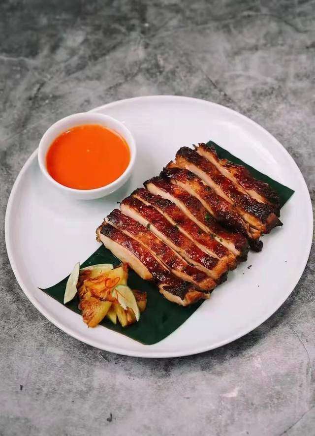 景颇烤鸡,事先将鸡腌制好,放秘制香料,在炭火上烤,待脆皮焦黄即食。此菜,讲究在蘸水,味道沉淀在满口香与甜上。