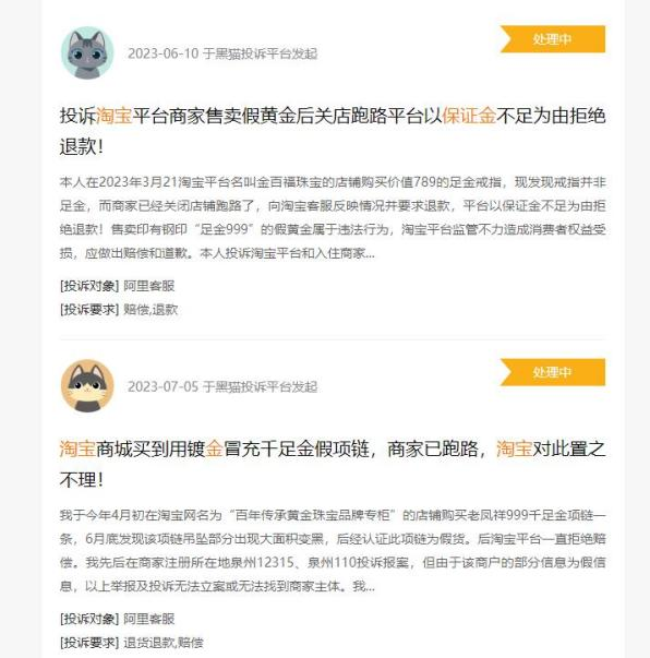 “3月21日,我在淘宝平台名叫‘金百福珠宝’的店铺购买价值789的足金戒指,发现戒指并非足金,而商家已经关闭店铺跑路了,向淘宝客服反映情况并要求退款,平台以保证金不足为由拒绝退款。”一位用户在黑猫平台投诉称。