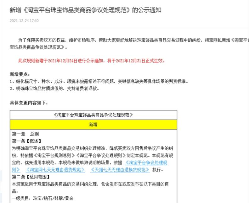 珠宝售后上,在2021年12月正式生效的《淘宝平台珠宝饰品类商品争议处理规范》中,淘宝新增要点包括:细化描尺寸、种水、成分、瑕疵未披露描述不符问题,关键信息缺失等具体场景的判责标准。明确珠宝饰品材质虚假的,支持消费者退款。