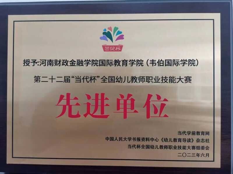 近日,第二十二届 “当代杯”全国幼儿教师职业技能大赛成绩揭晓,河南财政金融学院学前教育专业学生表现优异,获得多个奖项。本次参赛的38名学前教育专业学生共有48个参赛作品获奖,其中,一等奖5项、二等奖14项、三等奖13项、优秀奖16项;朱琳、杨红梅等五位老师荣获“全国促进幼儿教师专业化优秀指导奖”和“全国促进幼儿教师专业化优秀组织奖”;该校国际教育学院(韦伯国际学院)荣获“第二十二届当代杯全国幼儿教师职业技能大赛先进单位”称号。