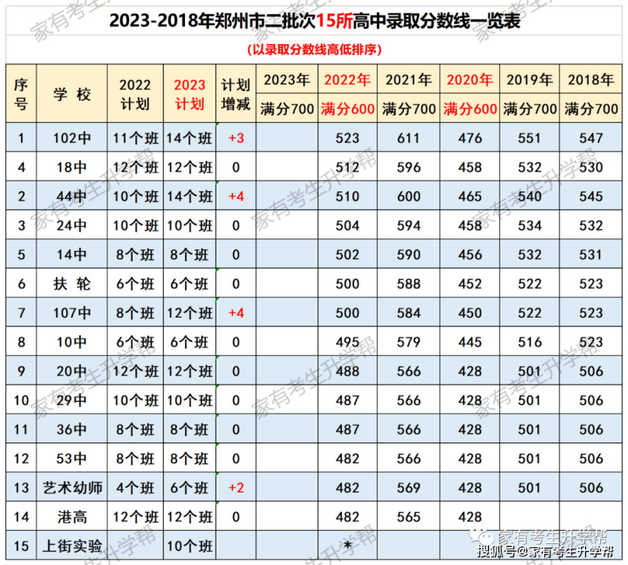 从另一个角度来看,2023年郑州市区普通高中招生计划比2022年增加了101个班,也就是约5050个学位,中考录取率按照70%左右计算,2023年比2022年多了5417*70%≈3792人升入普高,而学位增加的约有5050个,再加上今年公布的中考试题难度系数,综合来看今年建档线稍有下降是合理的。