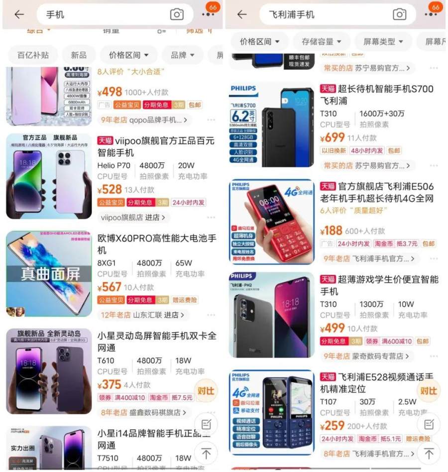 比如飞利浦手机,目前在淘宝、天猫平台就有多款手机在售,价格区间从188元到989元不等,功能根据价格不同,有双面屏智能、4G翻盖、轻奢商务、超长待机老人机、超薄游戏学生,甚至还有专用戒网瘾手机。