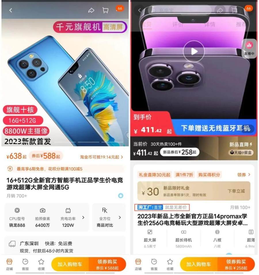 当然还有一种原因,平台实际上知道是“山寨机”,却默许甚至鼓励商家销售——“2023全新官方正品14promax学生价256G”,“淘工厂直营无差价”的无品牌名露出的手机,就是最好案例。