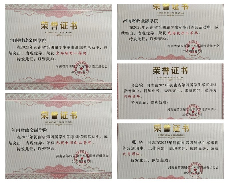 7月25日,河南省第四届学生军事训练营圆满结束,河南财政金融学院参训学生荣获定向越野集体一等奖、无线电测向集体二等奖、战场救护集体三等奖,张宸铭同学获优秀训练标兵,张磊老师获得优秀领队称号。