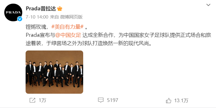 经历了代言人风波后,Prada于7月10日官宣了与中国女足的合作,并表示:为中国国家女子足球队提供正式场合和旅途着装。借由中国女足的出彩成绩与好口碑,Prada本次与女足的合作,在一定程度上挽回了其在代言人风波中受损的品牌形象。#Prada这次找对人了#的热搜中,很多网友表示:“这次总算不会再塌房了。”