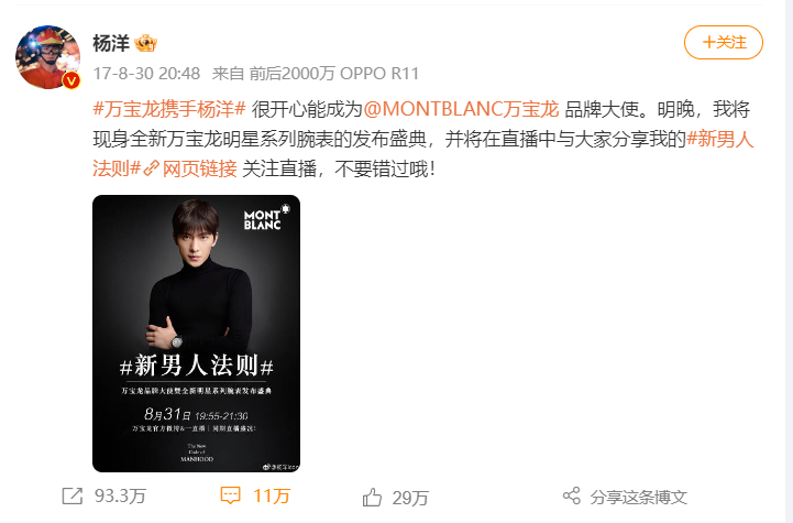 2016年,Burberry的第三季度财报显示销售收入同比上涨25%,当时外媒也将这种大幅上涨归因于吴亦凡带来的社交媒体影响力。2017年,雅诗兰黛宣布杨幂成为其中国及亚太部分地区的品牌代言人,官方透露,官宣杨幂的微博被转发了100多万次,并直接拉动品牌销售额增长500%,2019年,杨幂也顺利晋升为雅诗兰黛的全球代言人。