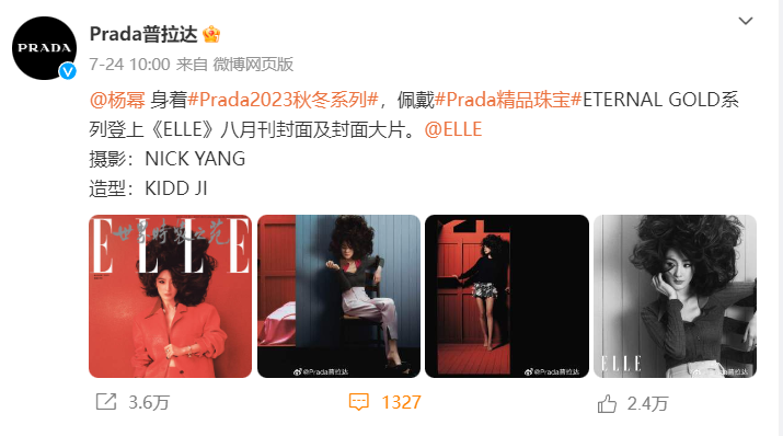 不得不提的是,虽然背负了“代言魔咒”的标签。但Prada依旧在积极寻找新的流量艺人,据知情人士透露,Prada去年就开始就接触杨幂了,今年杨幂的各个私服照更是频繁出现Prada的产品。虽然没有正式官宣,但7月24日,杨幂身穿Prada2023秋冬系列登上了《ELLE》八月刊的封面。很多人猜测,杨幂或许是Prada新的品牌代言人。