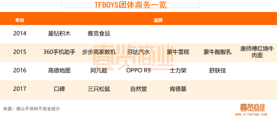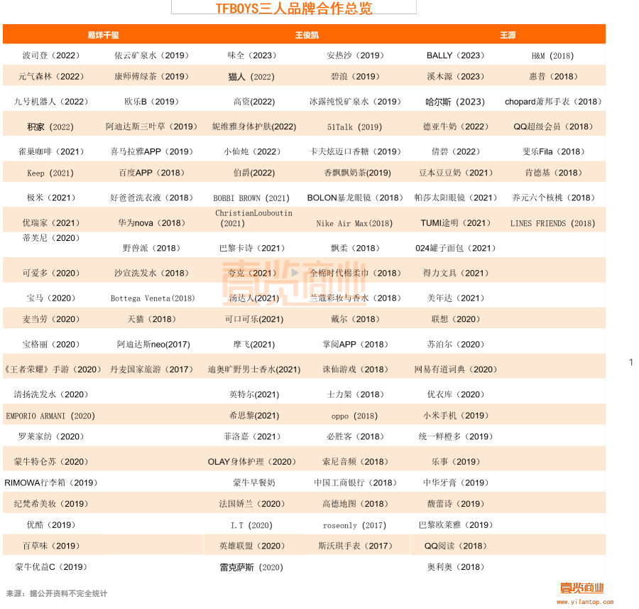 以2017年为节点,壹览商业统计了TFBOYS以组合形式承接的商务资源如下: