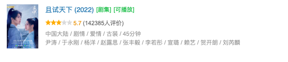 导演秦榛和杨欢此前也与腾讯合作密切,都没有出彩的代表作品。前者,代表作品中还算有点知名度的,就只有徐璐搭档林一的《良辰美景好时光》 (2021);后者独立执导的作品古装剧作品《成化十四年》豆瓣评分5.8,现代都市爱情剧《拾光里的我们》豆瓣评分6.0。