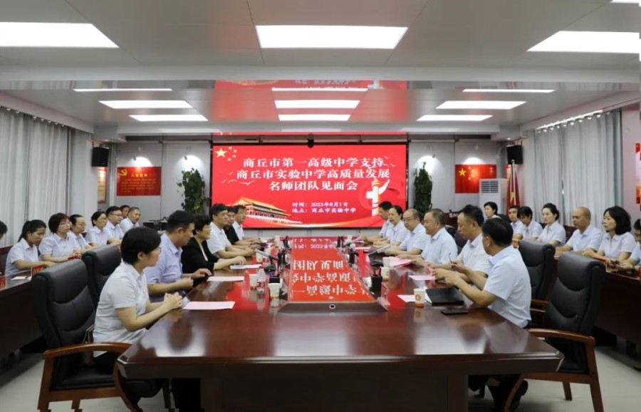 8月1日上午,商丘市第一高级中学支持商丘市实验中学高质量发展名师团队见面会在商丘市实验中学举行,第二批名师团队崔军明、崔苗、王鹏3名教师正式入驻商丘市实验中学。商丘市第一高级中学党委书记、校长牛超,党委副书记宋久成,副校长殷传宝,党委委员段北星,商丘市实验中学党委书记黄述学,商丘市实验中学校长刘庆华,领导班子成员以及招办、教务、课改部全体教师等参加会议。