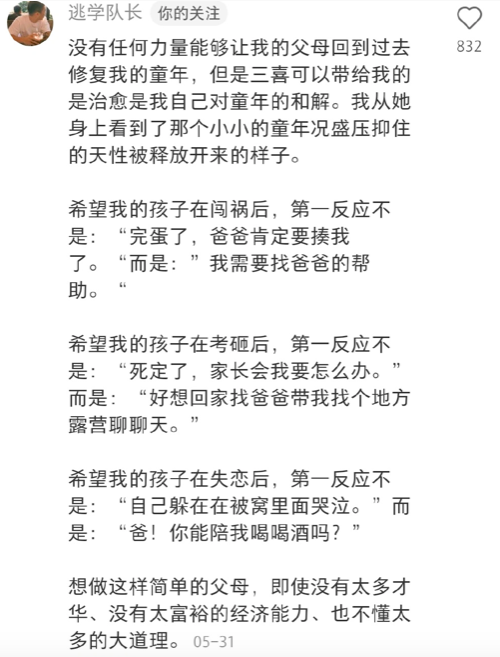 联想到不久前,火热社交媒体的话题“重新养自己”,三喜就像一个大众理想里追求的完美童年样本,父母感情良好,情绪自控力强,能够“蹲下”平视自己的孩子。这种充满被爱的氛围,足以让目前互联网主流用户——90一代人沉迷。