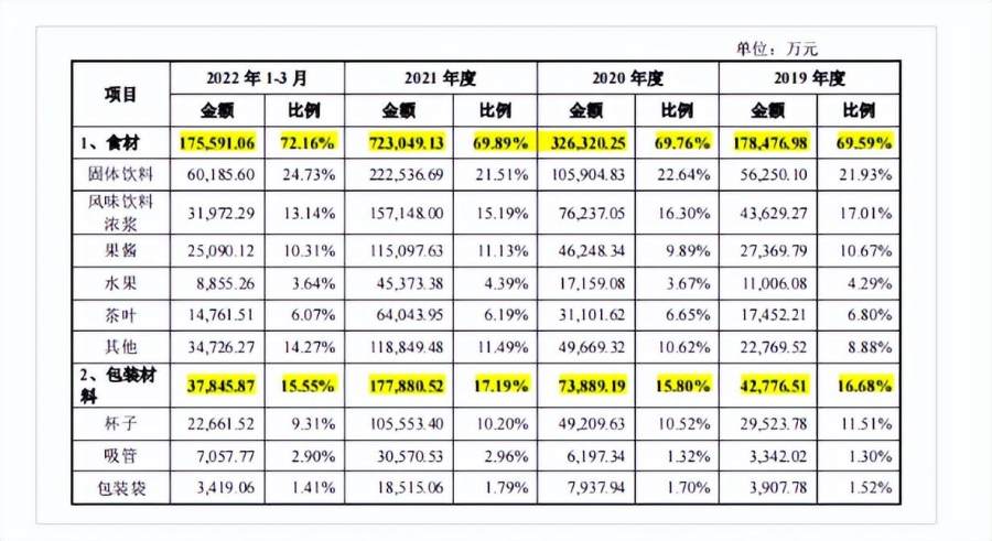一方面,蜜雪冰城招股书中所提到的22000家门店中,直营店为73家,加盟店为21582家。另一方面,从2019年到2022年的前三个月,蜜雪冰城最大的营收入来源便是食材和包装材料的收入,在蜜雪冰城主营业务收入中分别占比86.2%、85.5%、87%和87.7%,几乎接近九成。