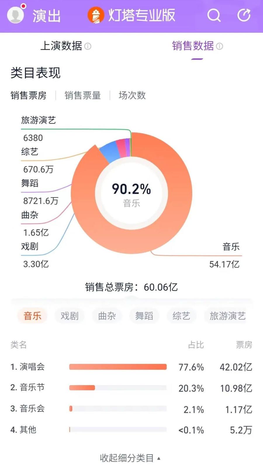 在这之中,演唱会收入贡献不小。灯塔专业版数据显示,截至8月13日,年度内累计产出的线下演出收入中,音乐类演出销售贡献在90%以上,其中,演唱会的票房收入占比超77%。