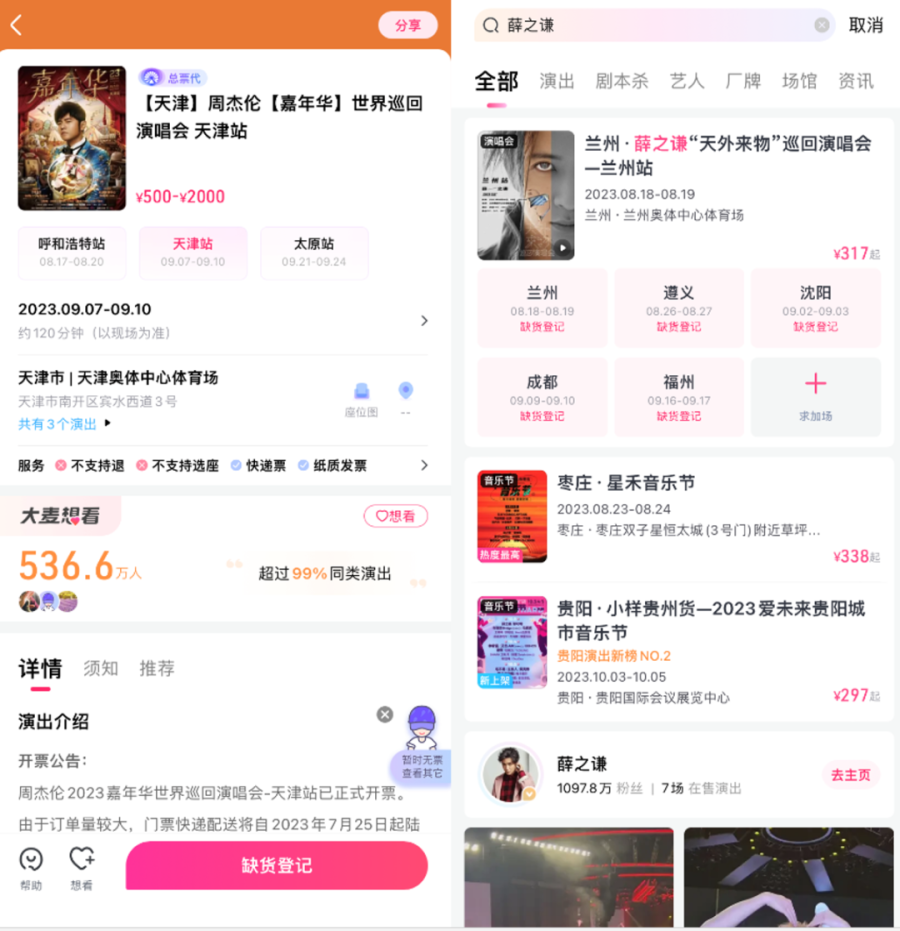 超头部演唱会供不应求,多场演唱会开票即秒空,从大麦平台的销售数据来看,张学友、周杰伦、薛之谦、五月天、林俊杰等歌手在售的演唱会,目前都处在“无票”、“缺货登记”的状态。