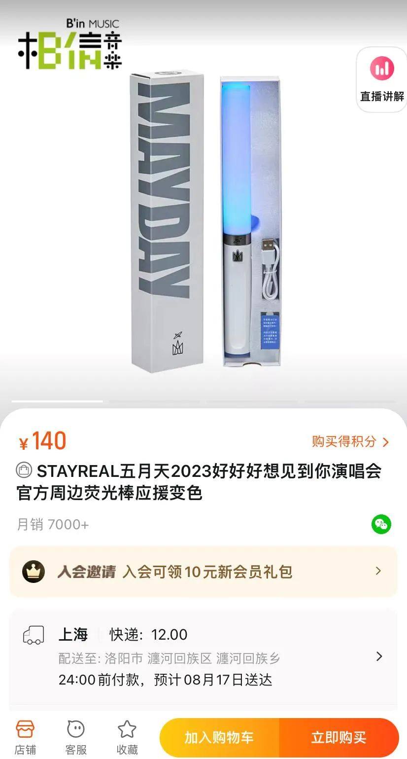 今年5月底至6月初,五月天在北京鸟巢连开6场演唱会,累计可容纳五十多万观众到场。当时,五月天背后的相信音乐推出了一款官方应援棒,出于对五月天的喜爱,大多粉丝都会选择购买正品,这款售价140元且不包邮的应援棒,5月在淘宝的销量随之超5万份,再加上现场及其他售卖渠道,仅这一款应援棒的月销售额预计就在千万以上。