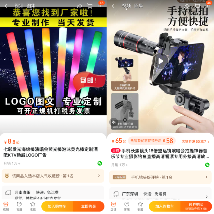 因此,演唱会的火热必然将带动应援产业链销量猛增,淘宝数据显示,今年3月份,荧光棒淘宝搜索量同比上涨169%,各色应援手牌、荧光发箍、彩绘脸贴、荧光手环等线下演唱会气氛道具亦出现大幅度增长。这一趋势延续至今,截至目前,淘宝多家店铺相关产品月销量破万。