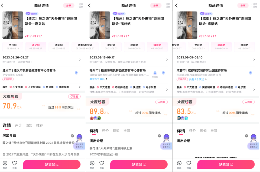 背后的原因在于,由于演唱会本身的稀缺性,演唱会的举办地对观众的消费决策影响更小。例如,大麦上,薛之谦当前在售的几场演唱会中,遵义、福州、成都等地的想看人数并没有相差太多。且即便举办地的位置能够影响到部分观众的消费决策,演唱会的辐射范围之大,大多情况下还是能够吸引到足够的观众前往,进而引发大规模的人群流动。