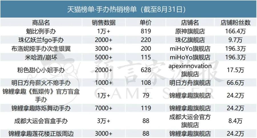 锦鲤拿趣旗舰店则占据了第7名、第8名和第10名的位置,都是影视IP周边,分别为《甄嬛传》官方盲盒手办、锦鲤拿趣陈烁舞动手办、锦鲤拿趣莲花楼正版周边。而这些周边都是暑期大热影视作品或经典影视的周边产品。