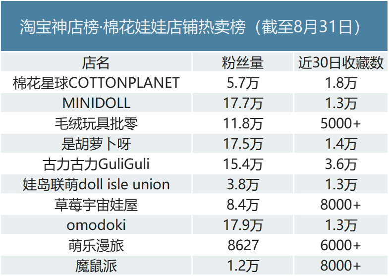 其余入榜的店铺分别为是毛绒玩具批零、是胡萝卜呀、古力古力GuliGuli、娃岛联萌doll isle union、草莓宇宙娃屋、omodoki、萌乐漫旅、魔鼠派。