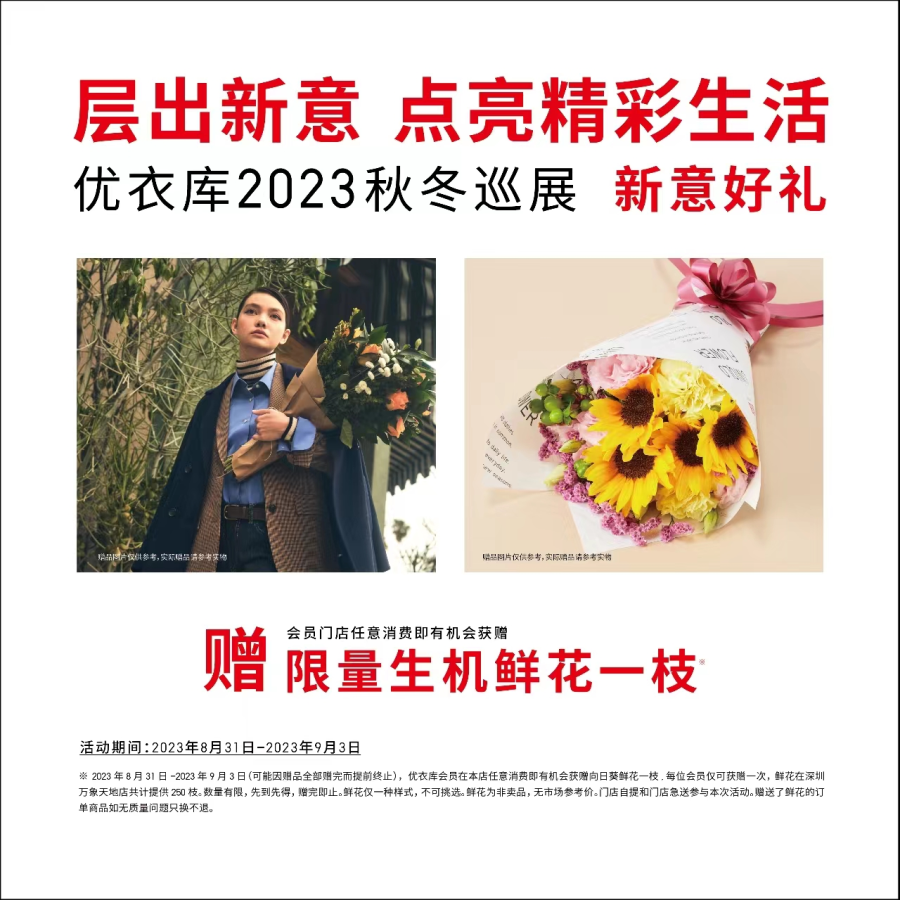 优衣库赋予实体生活更多品质幸福感!24省市新品巡展,华中地区超70店上新,全民秀品质·秀时尚:新品巡展将于8-10月陆续登陆24省市28城,更首次来到南昌/贵阳/呼和浩特等地!9月-12月底,优衣库预计在武汉/重庆/昆明新开4店。优衣库持续以全球及区域旗舰店融合产品设计/剪裁/工艺等细节体验与生活感场景,传递服装的品质设计与时尚机能价值,辐射湖南及周边华中地区,让消费者悦享线下生活的新鲜感与惊喜感!即日起,打卡巡展门店,抢先预览最新《LifeWear 服适人生》品牌册,感受LifeWear为全球人们的生活带来机能多元风格的现代叠穿艺术;打卡长沙IFS国金中心店,还有机会享限量生机鲜花买赠,更有OOTD照相馆等精彩门店新体验!9月6日起,官网会员还能领30元自提礼券!