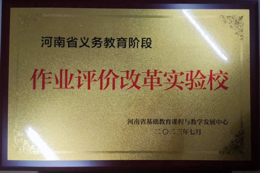 2023年7月,河南省基础教育课程与教学发展中心印发《关于确定河南省义务教育阶段作业评价改革实验校的通知》(豫基课程字〔2023〕20 号),我校喜获“河南省义务教育阶段作业评价改革实验校”荣誉称号。