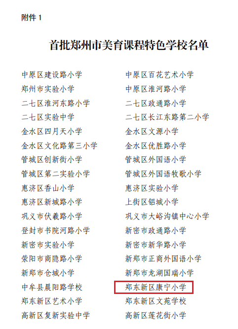 2023年8月,郑州市教育局发布《郑州市教育局办公室关于公布首批郑州市美育课程特色学校和郑州市美育实践基地遴选结果的通知》(郑教体卫艺函〔2023〕593 号),我校喜获“首批郑州市美育课程特色学校”荣誉称号。