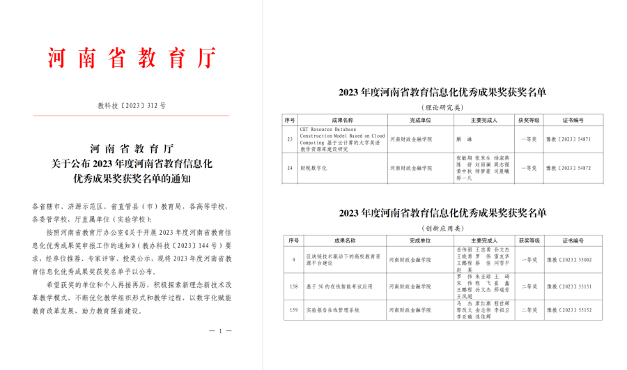 近日,河南省教育厅下发了《关于公布2023年度河南省教育信息化优秀成果奖获奖名单的通知》(教科技〔2023〕312号),河南财政金融学院共有5项成果获奖,其中理论研究类成果一等奖2项,创新应用类成果一等奖1项、二等奖2项。