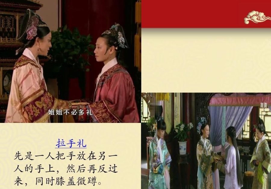 请安礼相对于跪拜礼而言,就不那么隆重,更多的是适用于平辈之间,或者亲属关系渐远的长辈。如果施礼人身穿官服,也需要先用右手弹下左腕袖头,再用左手弹下右腕袖口,然后再行请安礼。