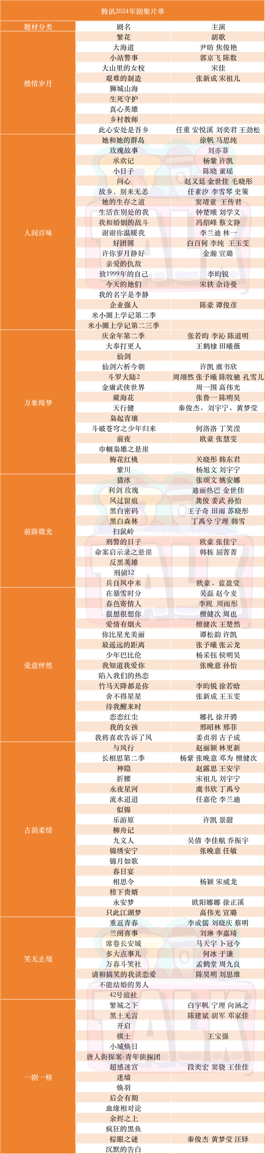 腾讯待播的110部作品中,有超过30%的作品暂未搜索到演员阵容及拍摄信息,大概率仍处于立项阶段。同时还有大量剧集作品与2023年度公开的片单重复。但腾讯仍有70+部作品已初现雏形或进入排播阵营,相比之下阵仗打的更大。