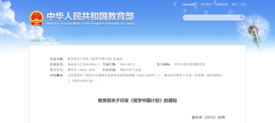 2010 年,为推动来华留学工作进一步发展,教育部制定了《留学中国计划》,明确到 2020 年,使我国成为亚洲最大的留学目的地国家。建立与我国国际地位、教育规模和水平相适应的来华留学工作与服务体系;形成来华留学教育特色鲜明的大学群和高水平学科群;培养一大批知华、友华的高素质来华留学毕业生。