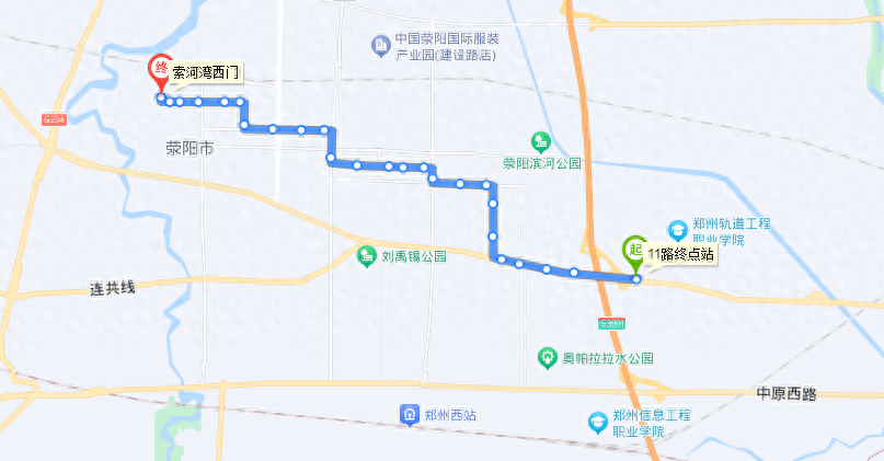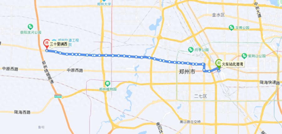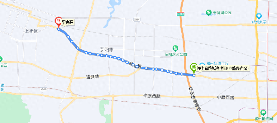 郑州G11路公交始发站为火车站北港湾,终点站在三十里铺西,票价1元。