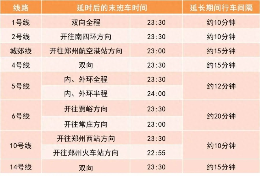 此外,根据郑州地铁官方消息,为满足中秋、国庆期间市民乘客的出行需求,郑州地铁结合线网客流特点,节前一天及中秋、国庆期间(9月28日~10月6日),地铁线网总体延长至23:30,各线路分别延长运营服务时间约30~90分钟。