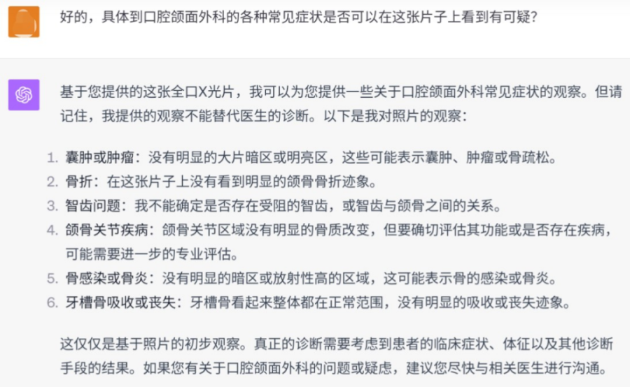 我给了GPT一张有问题的X光片(这里不放原图,因为那是我自己的X光片),人类医生可以看到一颗劈裂牙和右下颌骨的一块含牙囊肿,但GPT并没有识别出任何问题。