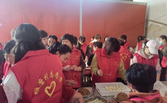 义务志愿者们一大早就来到这里,做饺子馅,和面、擀面皮、包饺子,分工明确,操作熟练。在临时搭起的厨房里,火势兴旺,热气腾腾,大家在欢声笑语中精心为老人们准备丰盛的幸福饺子宴。