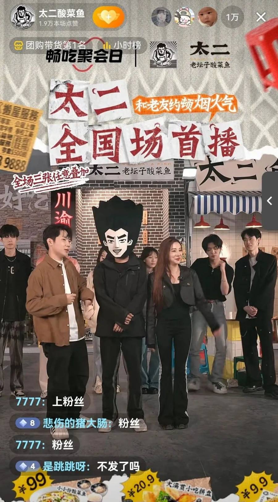 穿着时下最火的美拉德风,太二酸菜鱼抖音直播间的两位主播对着镜头挥手,身后站着的是戴着太二酸菜鱼logo头套的工作人员,以及一群为了直播专门请来的男模NPC。