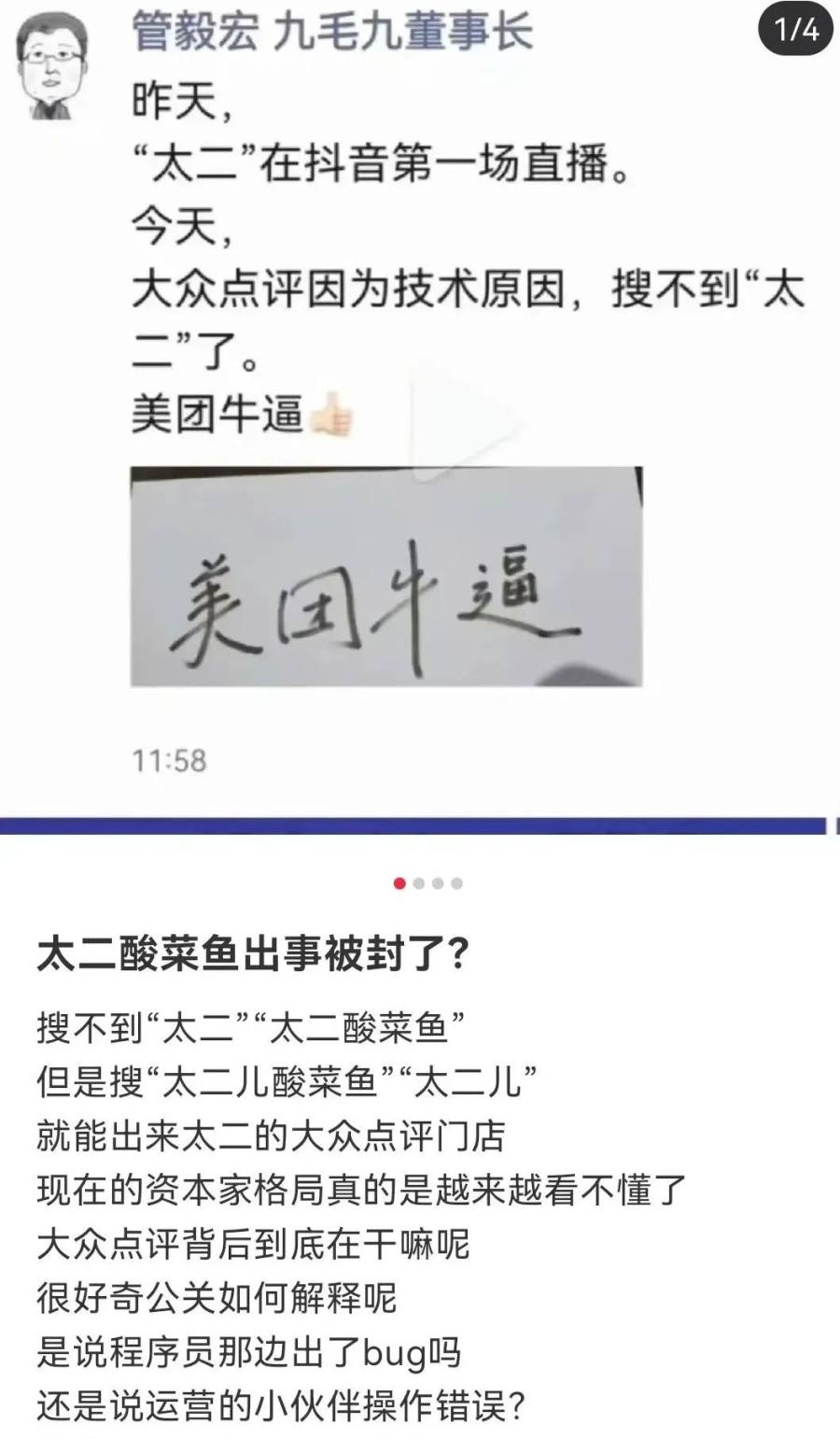 或许是因为被太二在自家平台多年,却突然低价“倒戈”不爽,又或者是真的碰巧遇上了“技术问题”,在抖音卖出1亿GMV的太二,第二天便消失在了美团和大众点评APP上。