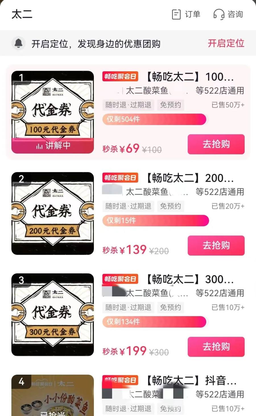 拓品新消费观察到,一些网友反映,近两天一些太二酸菜鱼的线下门店在用餐高峰期,开始需要等位。而拓品新消费也前往了某商圈商场的太二门店,不少消费者在结账时出示的是抖音的团购码。