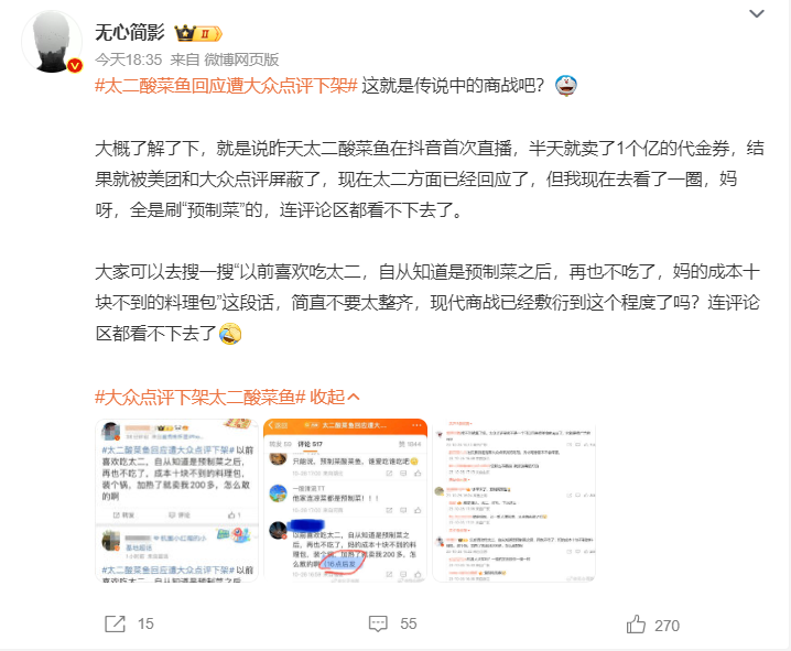 现在,大众点评也已经恢复了太二酸菜鱼的搜索词条,但这件事所产生的衍生影响还在蔓延。