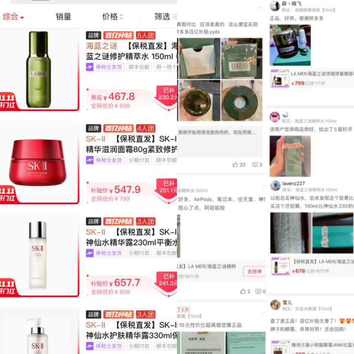 的确如此,在拼多多百亿补贴频道,大牌护肤品的价格被打下来了,400多就可以买到Lamer精粹水,600多就能买到SK-II神仙水,700多就能凑够一整套资生堂护肤品……让消费者花更少的钱,买到“贵妇级”护肤品。