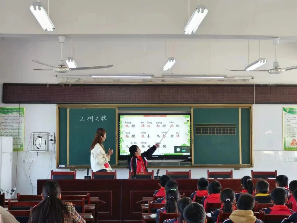 上午九点,活动正式开始。首先由首席教师工作室骨干成员宋江录老师执教二年级上册《树之歌》一课,本课是一首介绍树木特征的归类识字儿歌,主题单纯,内容浅显,重在识字。宋老师设置了学校招募“树木讲解员”的情境导入新课,激发学生的兴趣。在教学生字时,宋老师把木字旁的字放在一起,归为一类,运用形声字的特点及规律进行识记,并通过“识字大转盘”游戏,运用加一加的方法帮助学生快速识记,寓教于乐。宋老师还准备了标有树木名称的图片,图文并茂,对生字进行识记,丰富了课堂内容。在指导书写时,教师注重学生写字习惯的培养,不断提醒学生端正坐姿,并纠正学生错误的握笔姿势。学生在教师的指导下,观察生字结构,学习重点笔画的书写规则,一笔一划地书写,一个个端正漂亮的字跃然纸上。