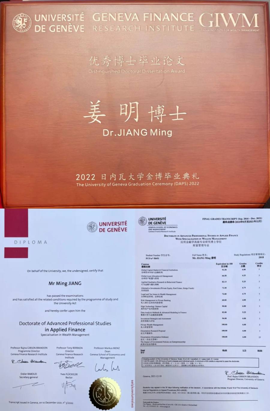 2022年,姜明以满分成绩通过瑞士日内瓦大学论文答辩,获得金融学博士学位,荣获优秀毕业论文!