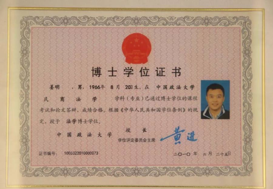 2010年,姜明获得中国政法大学民商法法学博士学位!