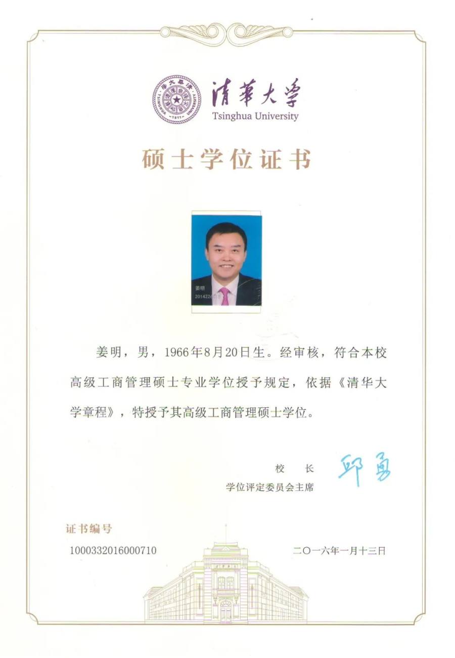 2015年,姜明获得清华大学五道口金融学院硕士学位!