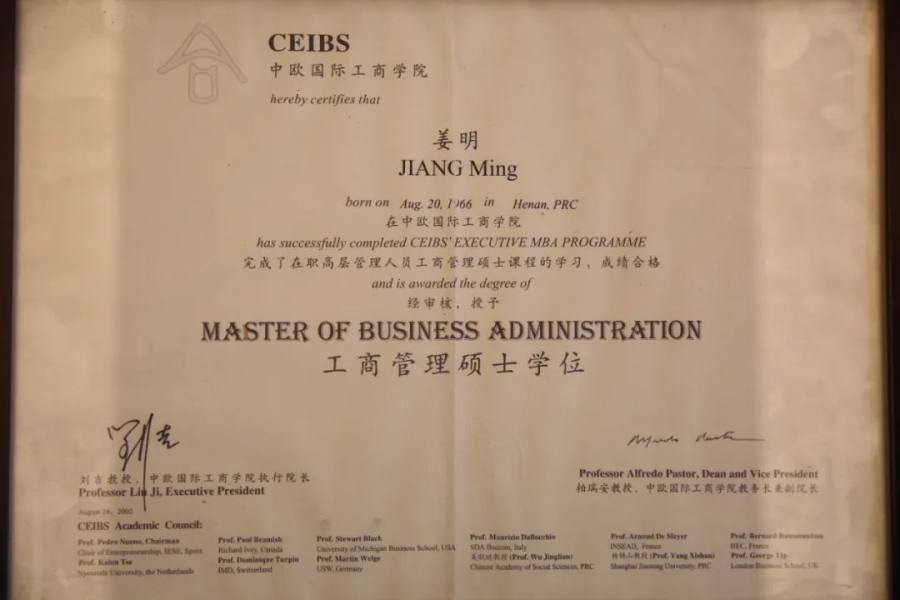 2002年,姜明获得中欧国际工商学院工商管理硕士学位!