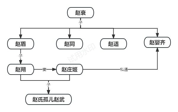 晋国公子重耳流亡的时候,晋国大夫赵衰紧随其后。重耳即位成为晋文公以后,为了感激赵衰的追随,就将自己的女儿赵姬嫁给他,并生了三个儿子。赵姬非常贤惠,劝说赵衰将早年间叔隗所生之子赵盾立为嫡长子。赵盾得到重用后,非常感激自己的庶母,就帮她的三个儿子也成为了晋国大夫,这就是赵同、赵括(读音 kuò,此赵括跟“纸上谈兵”的赵括不是一个人)、赵婴齐。